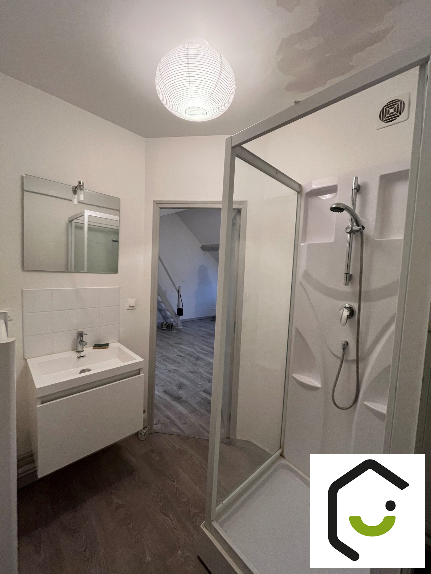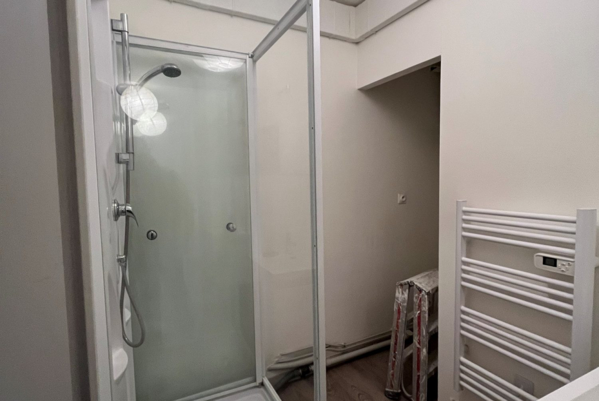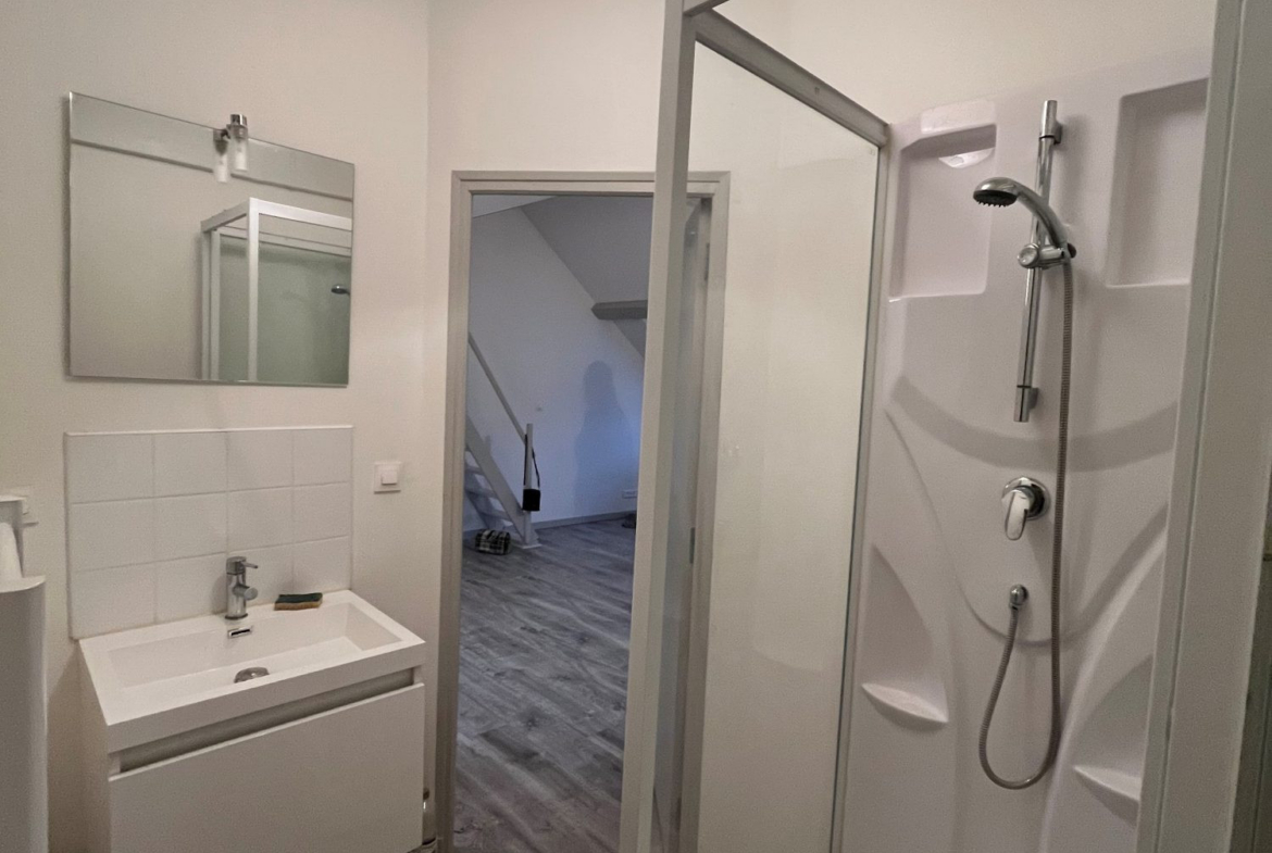 – d’une salle d’eau avec une douche, meuble lavabo, un radiateur sèche serviette, et un WC,