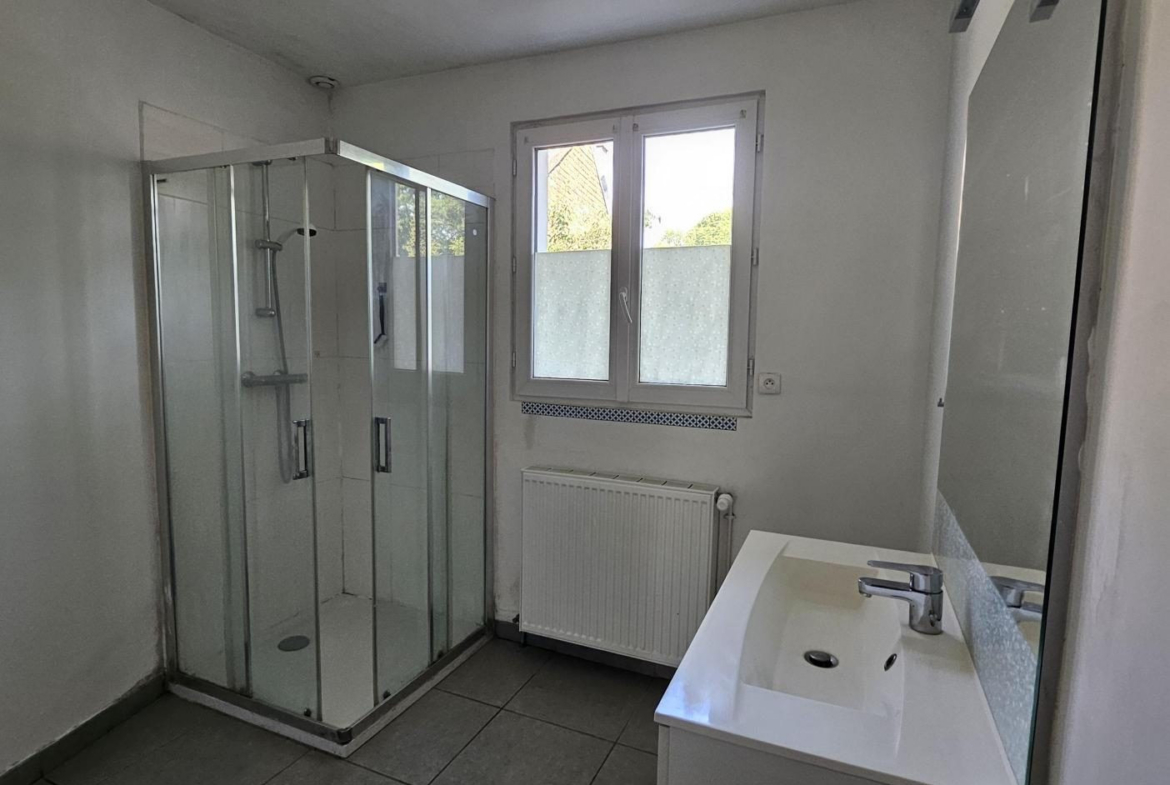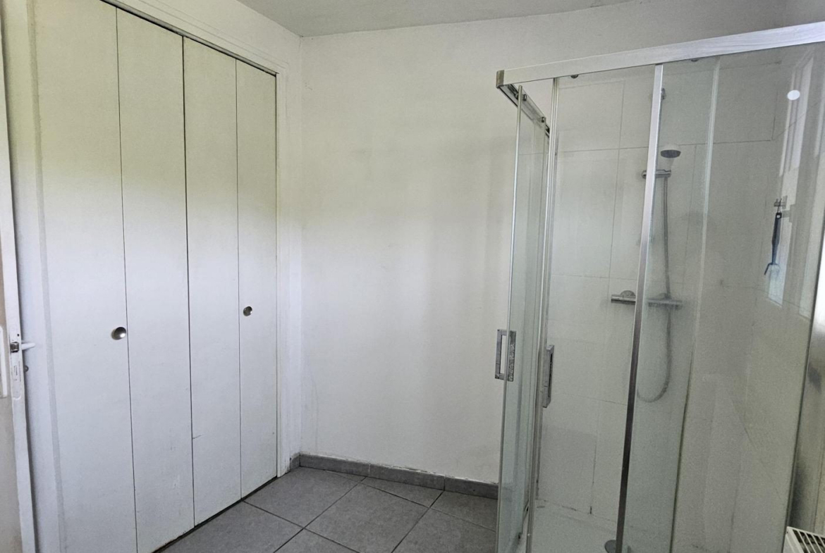 – Une salle d’eau avec douche, meuble vasque et grands placards de rangement,