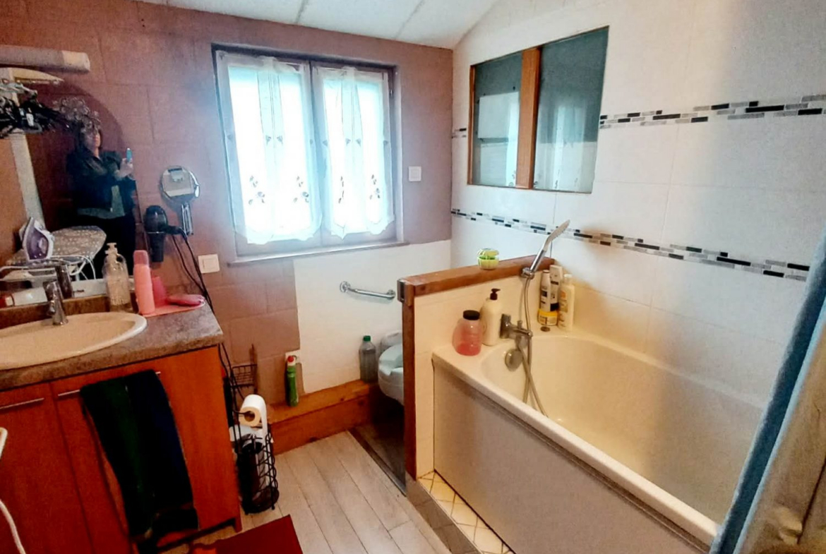 A l’étage un palier bureau, chambre. A l’extérieur terrain entièrement clos et arboré d’une surface totale de 909 m², garage de 21 m², chalet.
